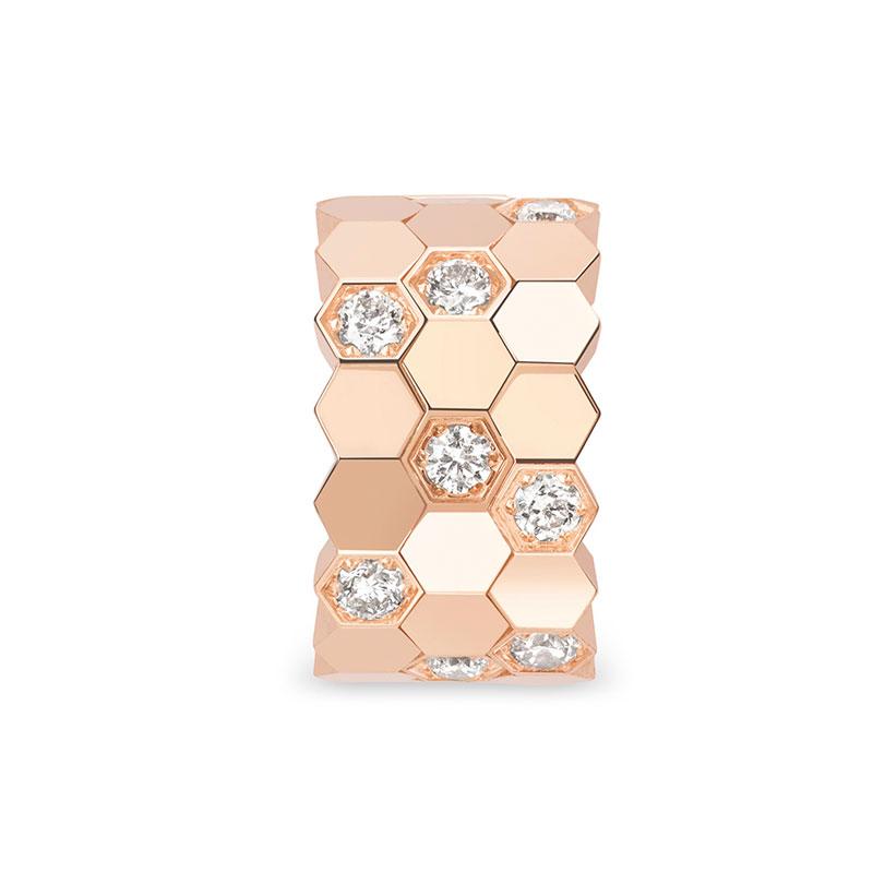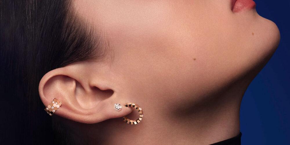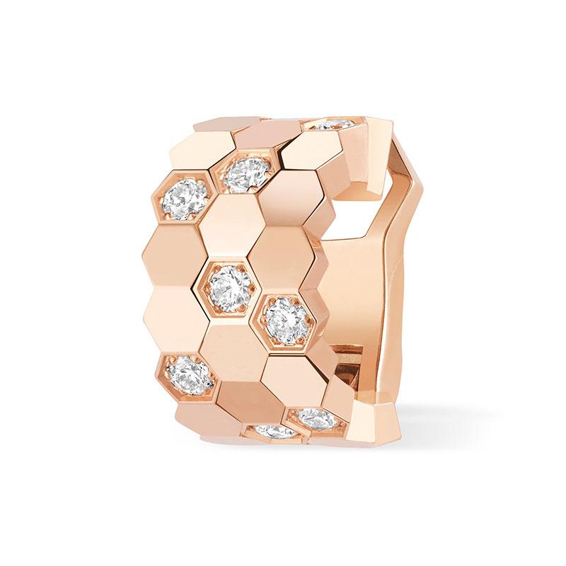El diseño está compuesto por celdas de panal de abeja engastadas con diamantes que pueden lucir de diversas maneras. Porque se puede colocar desde la parte superior de la oreja hasta el lóbulo, de manera individual o en pareja.