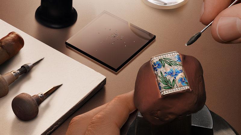 Hibiscus Diamonds combina la artesanía del esmaltado, el paillonnage y el engaste de diamantes en una interpretación de la exótica flor de hibisco.