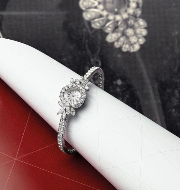Este reloj presenta un motivo de encaje en forma de cuadrifolio en la tapa trasera, elaborado en platino y adornado con engaste de diamantes.