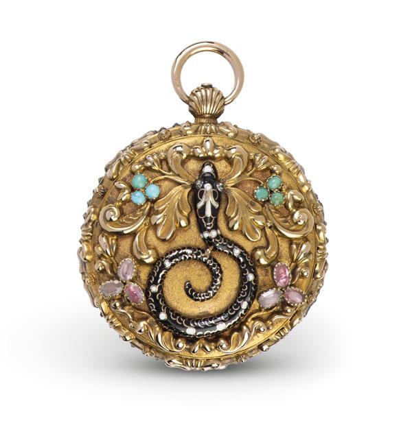 Este reloj de bolsillo de oro amarillo es un ejemplo del orientalismo, un estilo que fue muy popular a principios del siglo XIX. Su caja de 45 mm, que alberga una esfera plateada, está grabada en relieve utilizando la técnica ornamental del ramolayage. Este método consiste en ahuecar la base de oro macizo para revelar arabescos y motivos florales, los cuales luego se alisan con lima y se pulen. Para realzar la composición, se engastan piedras de turquesa y amatista a ambos lados de un motivo de serpiente blanco y negro en esmalte Grand Feu en relieve.