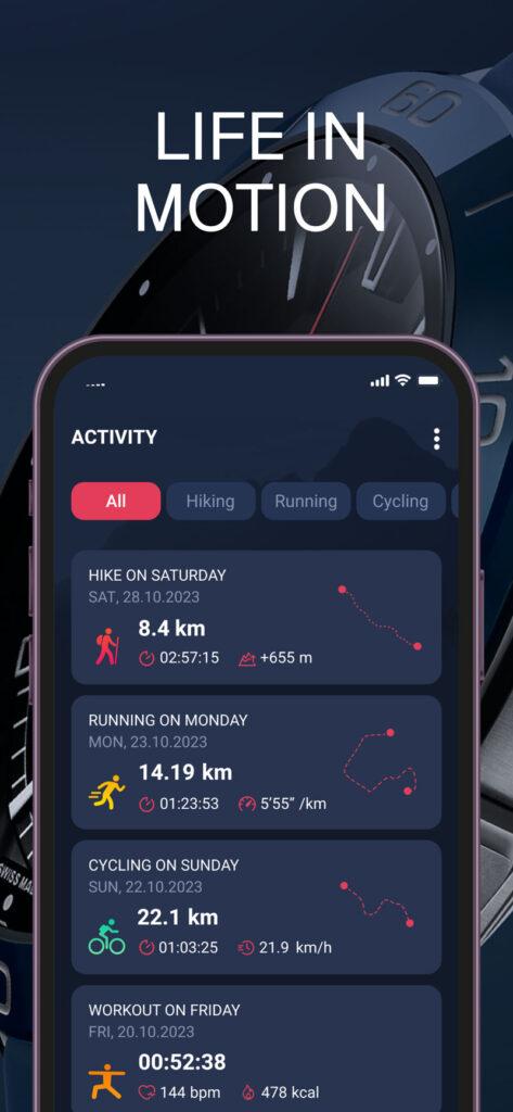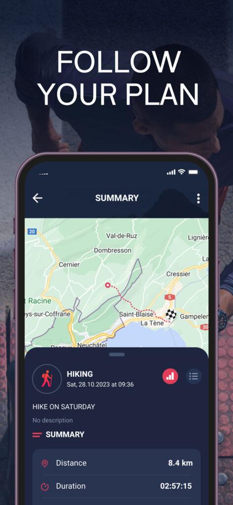 Entre las características del reloj y la aplicación hay varios tipos de entrenamientos y sus estadísticas. Además está permanentemente conectado. Aunque no pretende sustituir al teléfono.