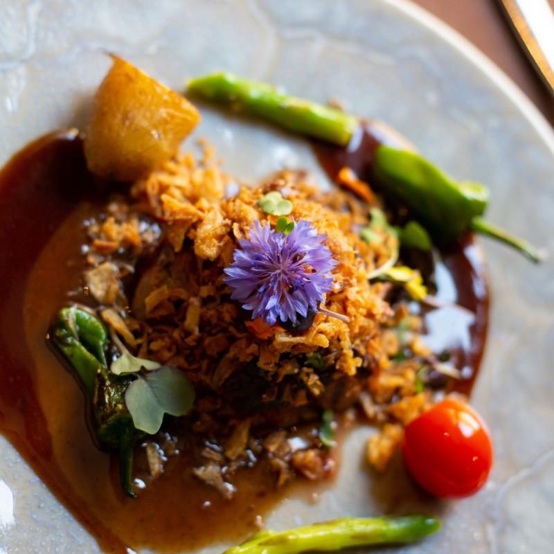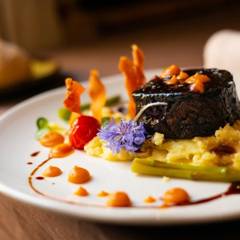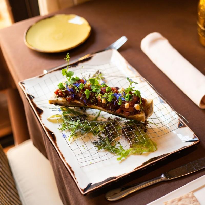 Comienza la velada con un crujiente de frambuesa con foie, una explosión de contrastes que despierta el paladar. Continúa con una costilla de Black Angus a baja temperatura, donde la carne se deshace en cada bocado, resaltando su jugosidad y profundidad de sabor. Y, para cerrar con broche de oro, un dulce que rinde homenaje a los enamorados: “Amor de pistacho”, una creación delicada y llena de matices que enamorará hasta el último suspiro.